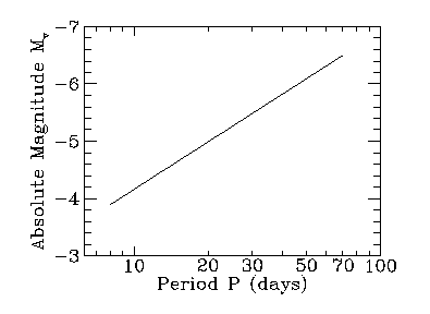 In order to find the distance to M100, you need to find the absolute magnitudes for each of the Cepheids. Henrietta Leavitt of the Harvard College Observatory discovered the relationship between the period of Cepheids and their average apparent magnitude mv. She had studied Cepheids in the Large and Small Magellanic Clouds, but did not know the distance to the Cepheids, and therefore could not establish absolute magnitudes or luminosities for the Cepheids. Harlow Shapley determined the calibration needed to turn Leavitt's period - apparent magnitude diagram (P-mv relation) into a period-luminosity relation (P-L relation) for Cepheids. Since the luminosity of a star is related to its absolute visual magnitude (Mv), we can express the P-L relationship as a P-Mv relationship. The P-Mv relationship for M100 is shown graphically below: