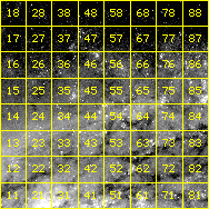 In this demonstration, the usual text for the Cepheid hunt will be in normal type. The added demonstration text will be in red type. The blinked images you viewed in the last section (Classifying variable phenomena on HST images) were of grid section 26. Click on grid section 26 in the image below to see a typical Web page for a grid section containing no known Cepheids: